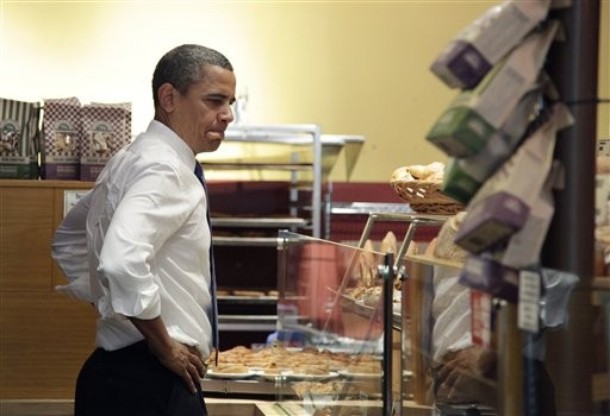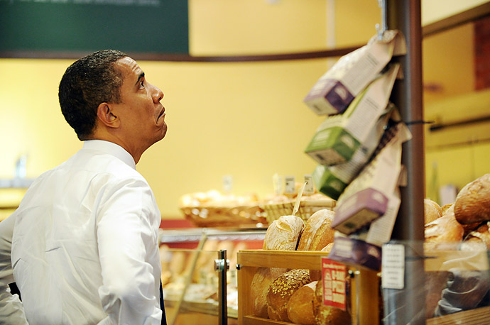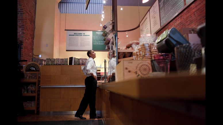 President Barack Obama looks at the menu as he orders his lunch before holding a round table discussion with local small business owners at Grand Central Bakery in Seattle, Washington, Aug. 17, 2010. (Official White House Photo by Chuck Kennedy)