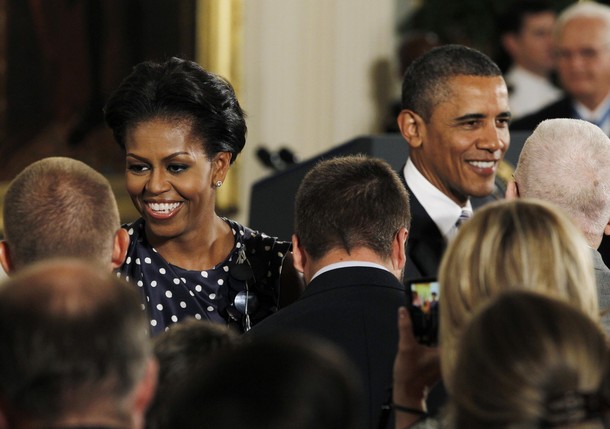 President Barack Obama, first lady Michelle Obama and former Marine Cpl. Dakota Meyers walk into the East Room of the White House before the president awarded Meyers, 23, from Greensburg, Ky. the Medal of Honor