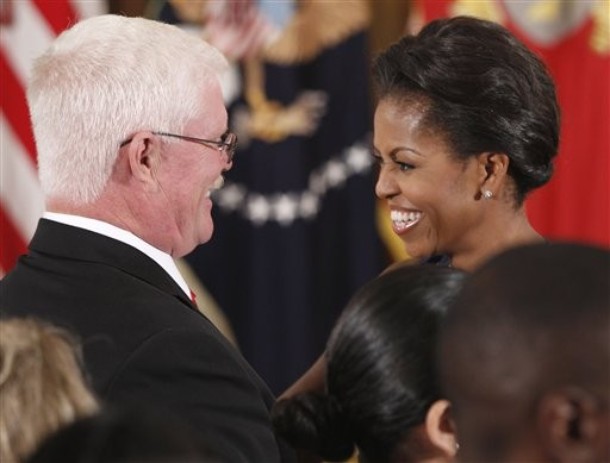 First lady Michelle Obama hugs Mike Meyer, father of Dakota Meyer, after Dakota was awarded the Medal of Honor