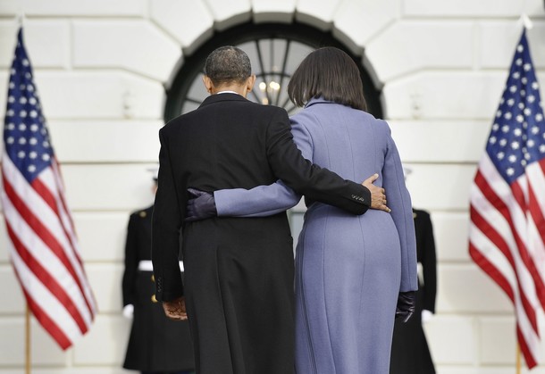 President Barack Obama and First Lady Michelle Obama observe a moment of silence on the 13th anniversary of the 9/11 attacks at the White House in Washington.
