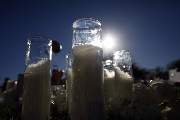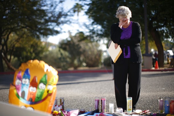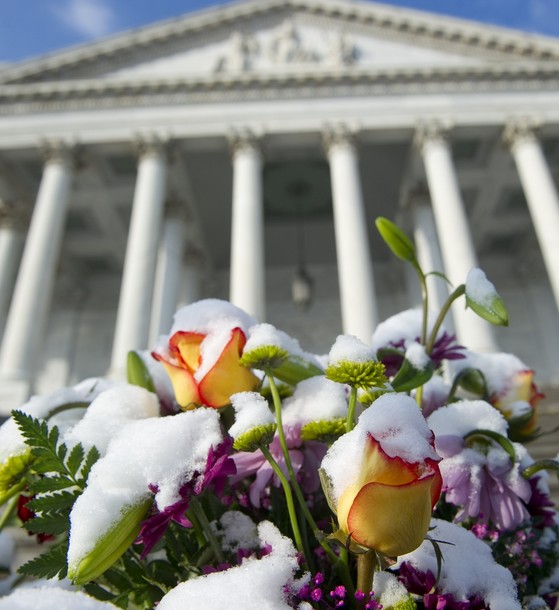 A layer of snow covers flowers left as part of a memorial at the US Capitol in honor of the victims of the shooting in Tucson