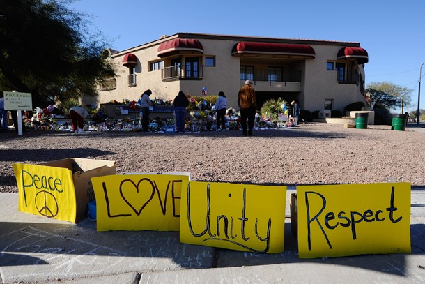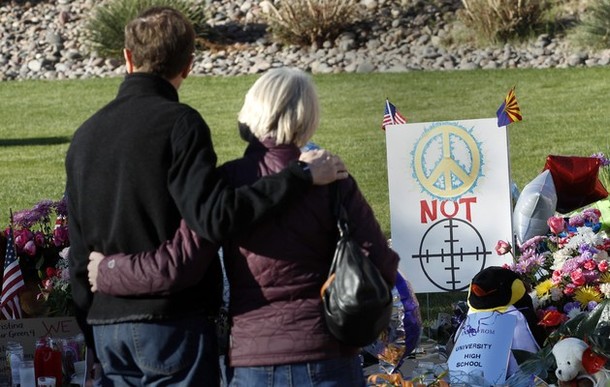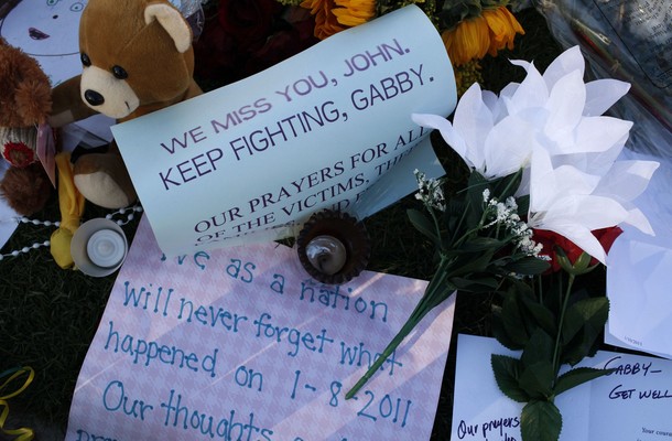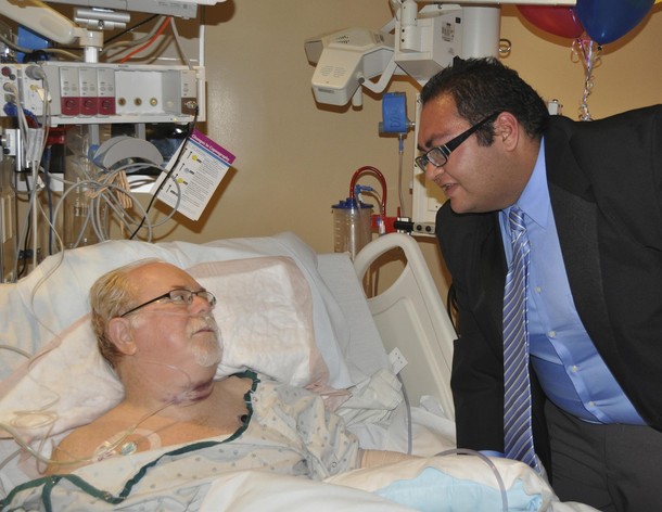 Ron Barber, District Director for Rep. Gabrielle Giffords, is visited by Daniel Hernandez in his hospital room at the University Medical Center in Tucson. Hernandez, who works with Barber as an intern for Rep Giffords, rushed to Giffords’ aid after she was shot. While holding the wounded Giffords, Hernandez asked another bystander to put pressure on Barber’s wounds. He also asked Barber for his wife’s phone number and then shouted it out to someone so that Barber’s wife, Nancy, could be informed of the shooting. Barber was extremely grateful and impressed with Hernandez’s composure under the circumstances and had been asking to see him after he had gained strength following surgery.