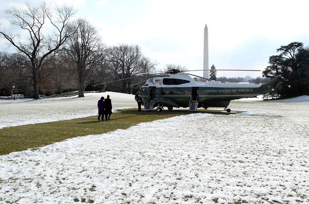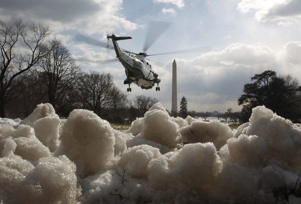 Marine One kicks up overnight snowfall on the South Lawn of the White House….