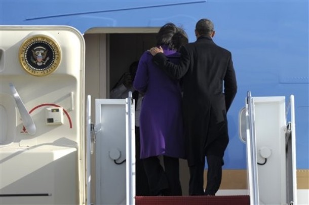 President Barack Obama stands with Secretary of State Hillary Rodham Clinton during the transfer of remains ceremony at Joint Base Andrews, Md., Sept. 14, marking the return to the United States of the remains of the four Americans killed in Benghazi, Libya (Pete Souza)