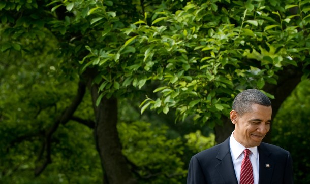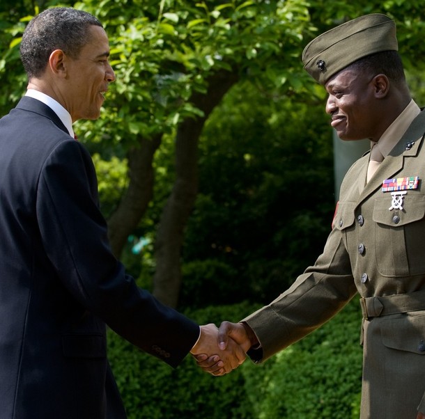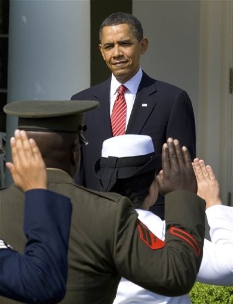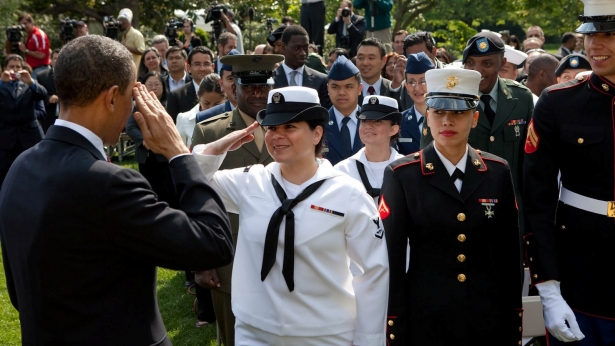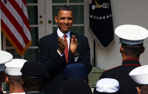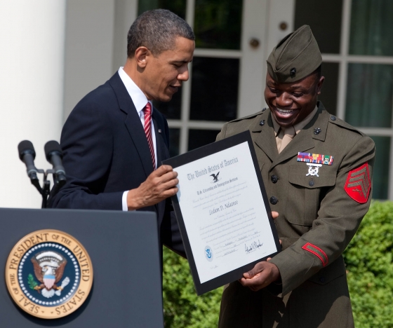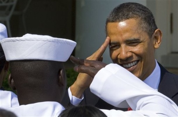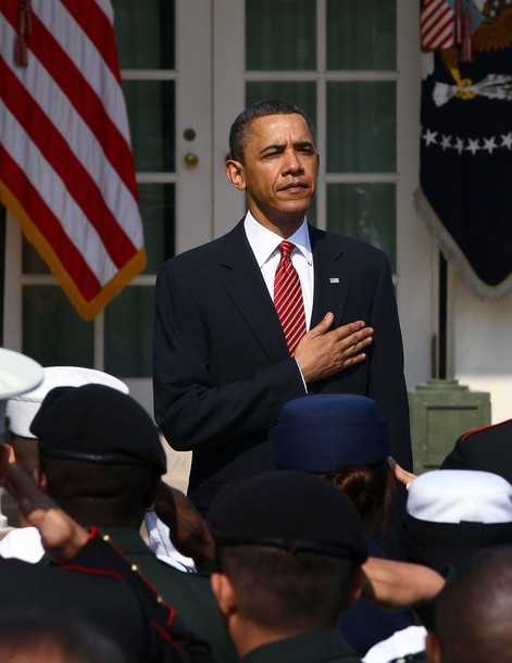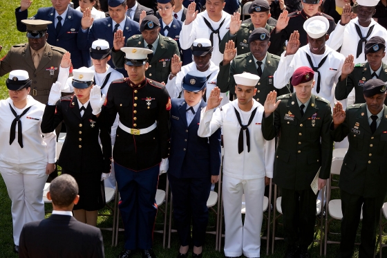 President Obama hugs Army Sgt. Stephanie Van Ausdall after she had trouble leading the Pledge of Allegiance following a naturalization ceremony for active duty service members and civilians, July 4