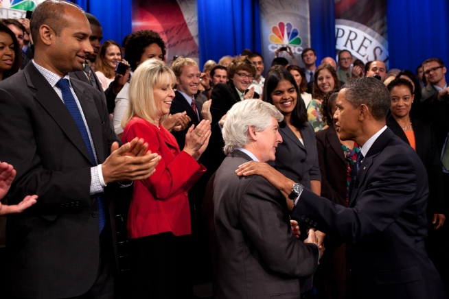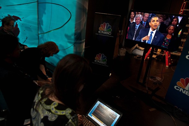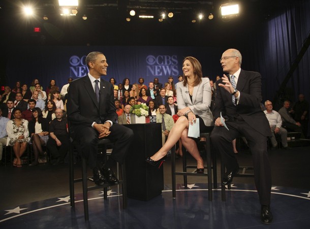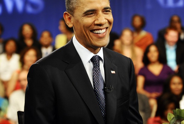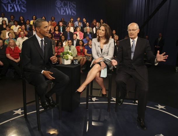 President Barack Obama adjusts his earpiece during a town hall event with television hosts Jose Diaz Balart and Enrique Acevedo, far left, at the Newseum in Washington. The event was broadcast in both English and Spanish languages