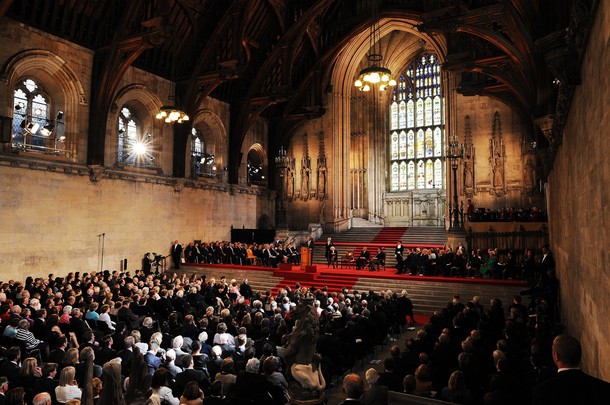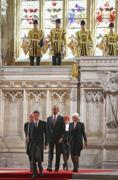 President Obama, escorted by John Bercow, Speaker of the House of Commons, and Helen Hayman, Lord Speaker of the House of Lords, walks into Westminster Hall to address members of both Houses of Parliament