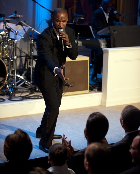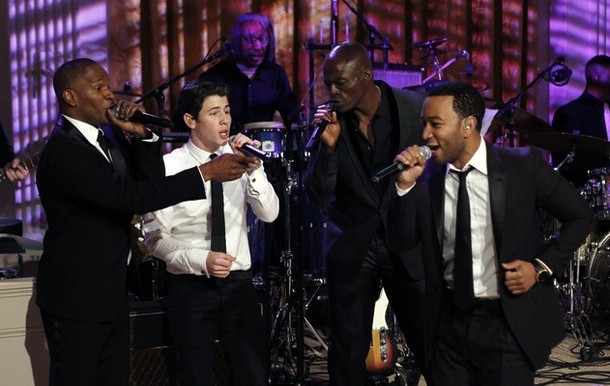 From left, Jamie Foxx, Nick Jonas, Seal and John Legend perform a medley during a tribute to Motown hosted by President Barack Obama at the White House in Washington, February 24