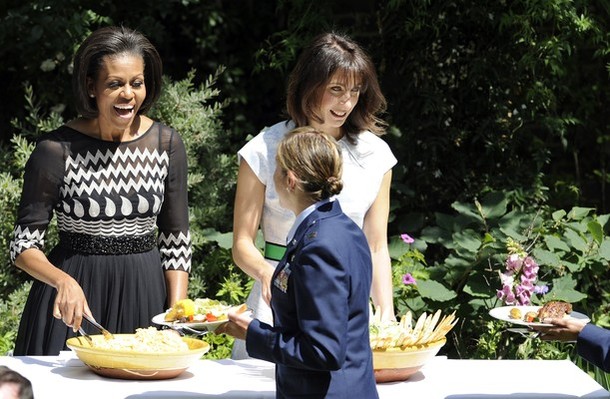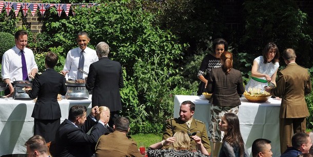 Michelle Obama and Samantha Cameron serve food at a barbecue for British and American service members and veterans at Downing Street