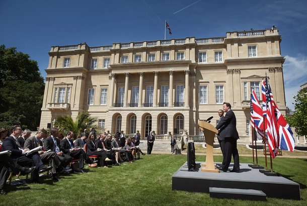 President Obama arrives for a news conference to be held with PM David Cameron at Lancaster House in London