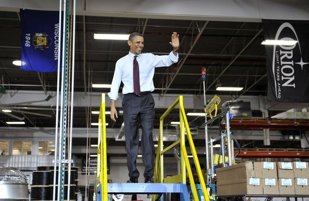 President Obama is seen through a window backstage at the General Motors Lake Orion Assembly Plant in Orion Township, Mich., Oct. 14. (Official White House Photo by Pete Souza)