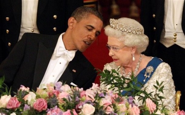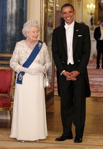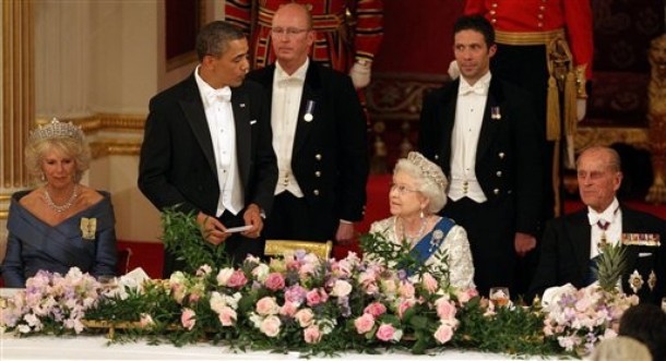 President Obama and first lady Michelle Obama welcome Queen Elizabeth and Prince Philip for a reciprocal dinner at Winfield House
