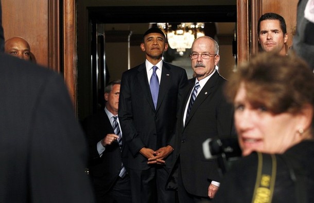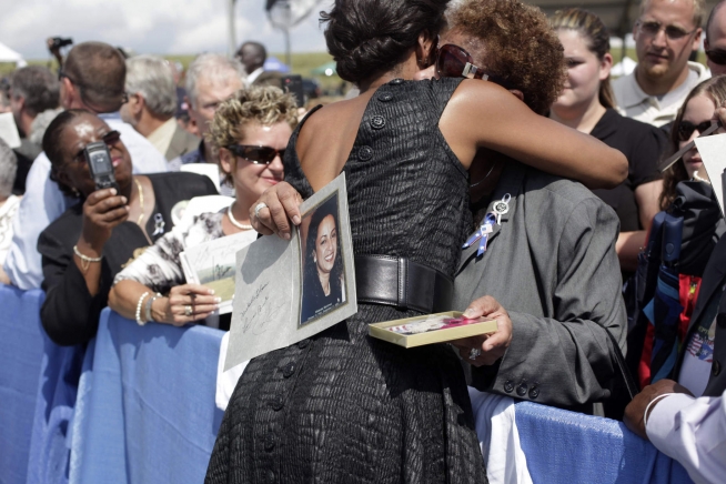 A woman hugs President Barack Obama as he greets guests following a ceremony commemorating the tenth anniversary of the 9/11 attacks against the United States, at the Flight 93 National Memorial in Shanksville, Pa., Sunday, Sept. 11, 2011. (Official White House Photo by Pete Souza)