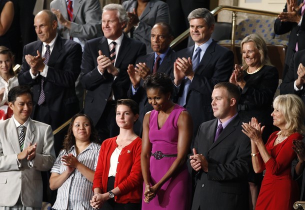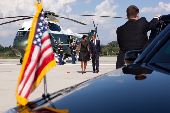 First Lady Michelle Obama walks across the tarmac with Megan Soukup, 9, and Joseph Hudella, 10, participants in the Defending the Blue Line program, as she prepares to greet military families at Minneapolis-St. Paul International Airport in Minneapolis, Minn., March 16, 2012. The First Lady traveled to Minnesota to meet with National Guard families and local community leaders dedicated to supporting military families. (Official White House Photo by Sonya N. Hebert)