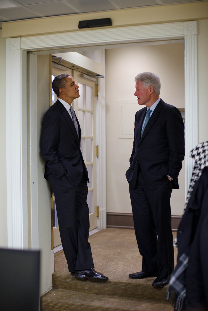Dec. 10, 2010: “The President had just met with former President Clinton late on a Friday afternoon. When they emerged from the Oval Office, the President said, “We’re going to the press briefing room.” I had walked ahead of them and, upon reaching the briefing room, found that the door was locked: the press office staff were all attending a White House Christmas party in the residence. So we went to find Robert Gibbs. “We’re looking for some reporters,” the President said, when we found Robert Gibbs in his office. Returning to the briefing room, the two Presidents waited until someone found a key, before doing an impromptu news conference.” (Official White House Photo by Pete Souza)