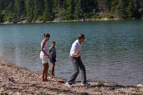 July 17, 2010: “On a weekend trip to Acadia National Park in Maine, the President showed his daughters, Malia and Sasha, how to skip stones during a hike in the park.” (Official White House Photo by Pete Souza)