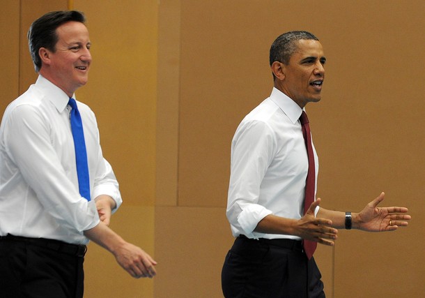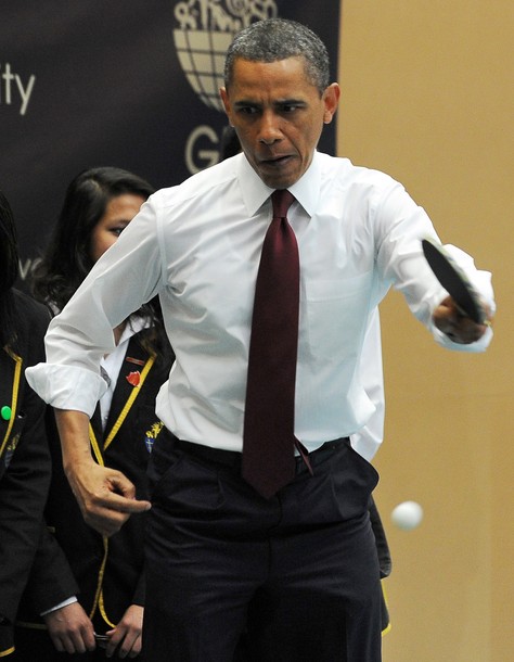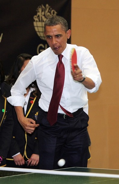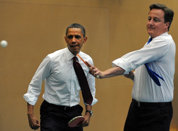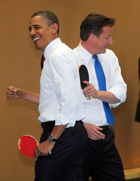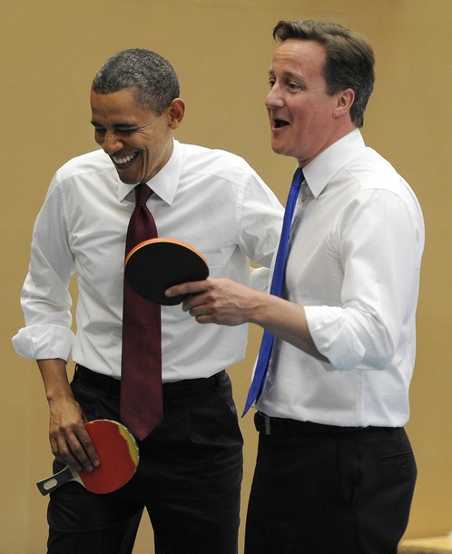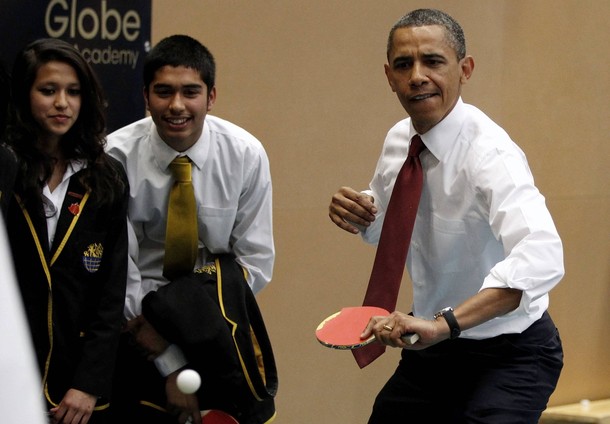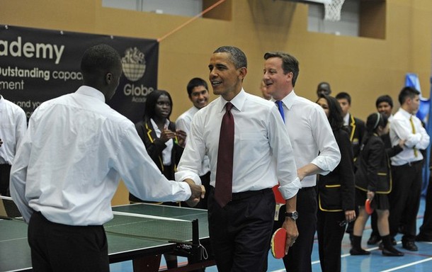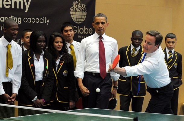 President Obama and British Prime Minister David Cameron play table tennis with students of the Globe Academy school in London on May 24