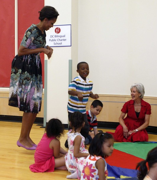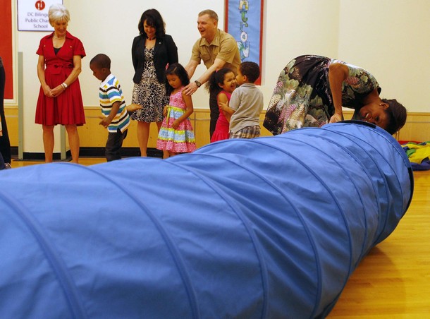 First Lady Michelle Obama runs an obstacle course with Maria Valles, a student at CentroNia bilingual child care center, during a tour of the center in Washington on June 8