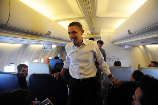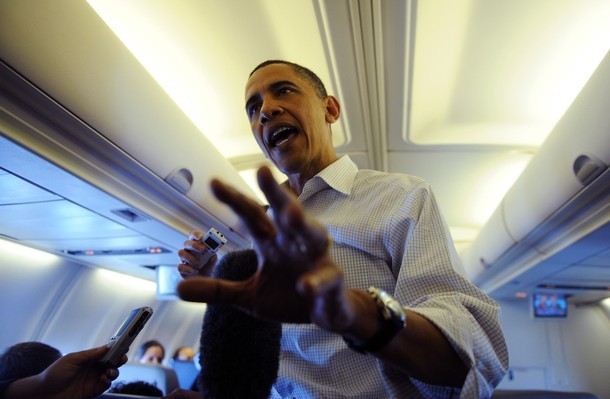 President Barack Obama speaks with the travelling pool on board Air Force One on April 28, 2010.