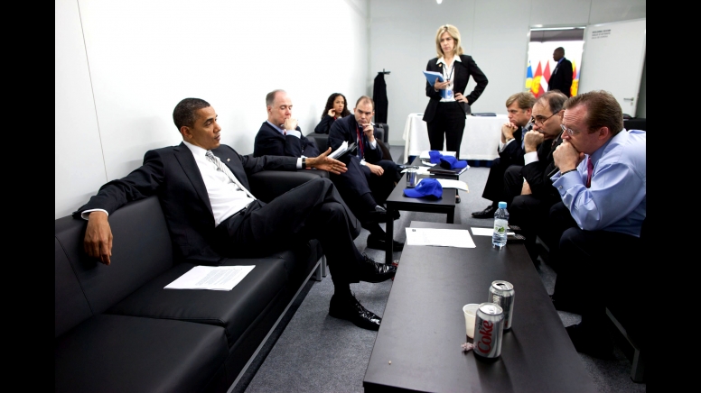 President Barack Obama meets with staff including, from left, National Security Advisor Tom Donilon, Ben Rhodes, Deputy National Security Advisor for Strategic Communication, Chief of Staff for Policy Mona Sutphen, Liz Sherwood-Randall, Senior Director for European Affairs, Mike McFaul, Senior Director for Russian and Central Asian Affairs, Senior Advisor David Axelrod, and Press Secretary Robert Gibbs at the NATO Summit in Lisbon, Nov. 20, 2010. (Official White House Photo by Pete Souza)