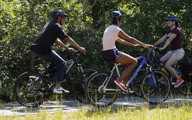 President Barack Obama, flanked by Veterans Affairs Secretary Eric Shinseki, and Vice President Joe Biden, welcome the Wounded Warrior Project’s Soldier Ride to the South Lawn of the White House in celebration of the seventh annual Soldier Ride.