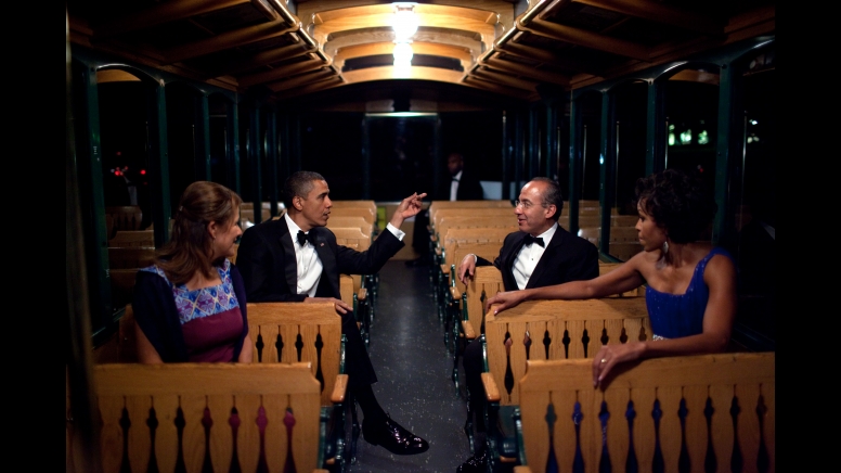 President Barack Obama, First Lady Michelle Obama, President Felipe Calderón of Mexico, and his wife, Mrs. Margarita Zavala, ride a trolley to a tent on the South Lawn of the White House, for the State Dinner reception, May 19, 2010. (Official White House Photo by Pete Souza)