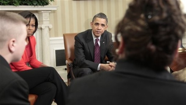 President Barack Obama and first lady Michelle Obama meet with students and parents from the Conference on Bullying Prevention in the Oval Office of the White House, March 10