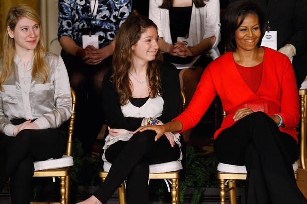 First lady Michelle Obama sits with Emily and Sarah Buder. The Buder sisters started a letter-writing campaign to raise a bullied girl’s spirits and turned the project into a book.