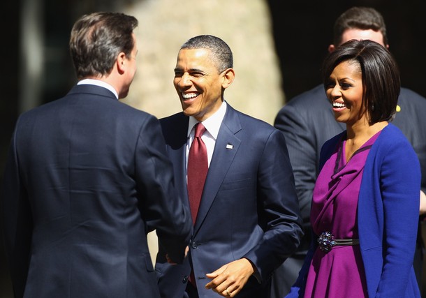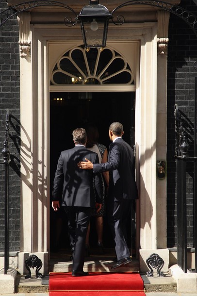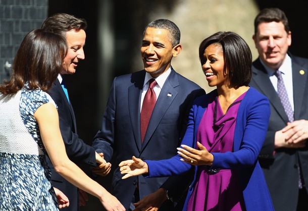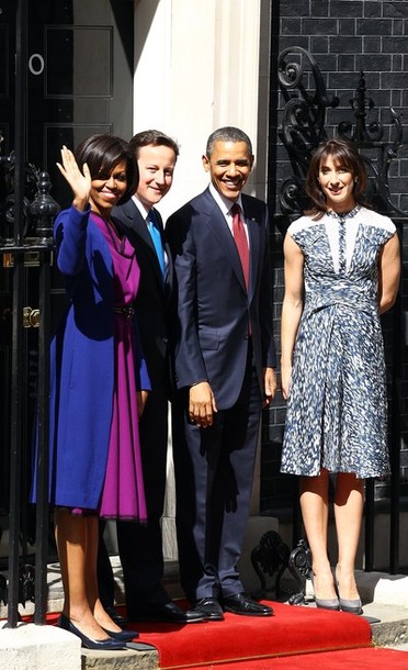 President Obama and his wife Michelle are greeted by British Prime Minister David Cameron and wife Samantha outside number 10 Downing Street