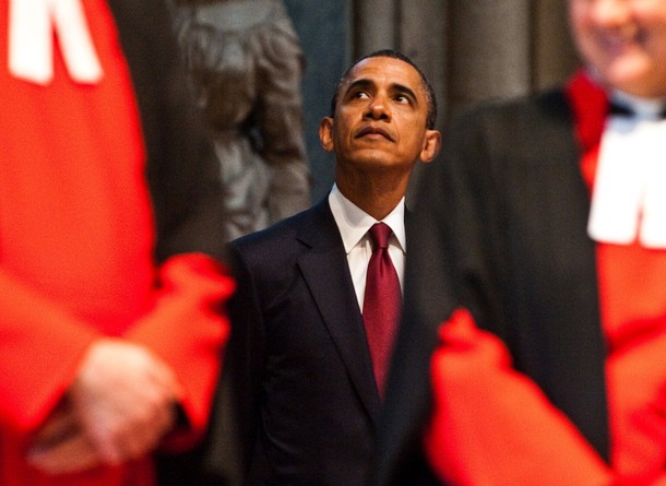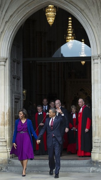 President Obama walks with the Dean of Westminster the Very Reverend Dr. John Hall as he visits Westminster Abbey
