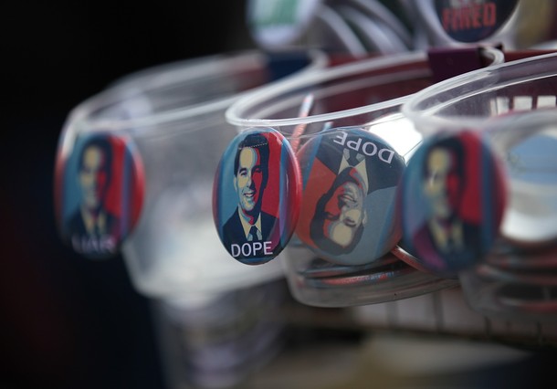 Buttons showing the face of Wisconsin governor Scott Walker are displayed during a demonstration outside of the Wisconsin State Capitol