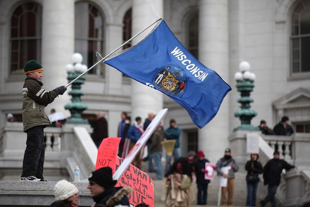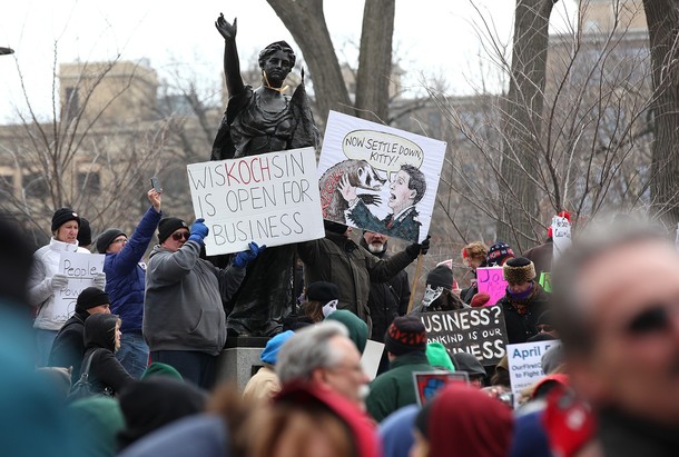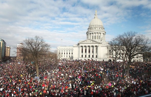 Thousands of demonstrators protest outside the Wisconsin State Capitol March 12