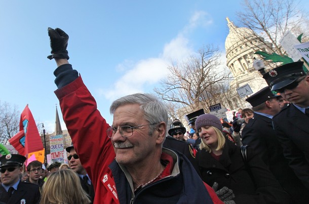 Democratic Wisconsin State Senator Mark Miller greets supporters while marching around the Capitol with protestors March 12
