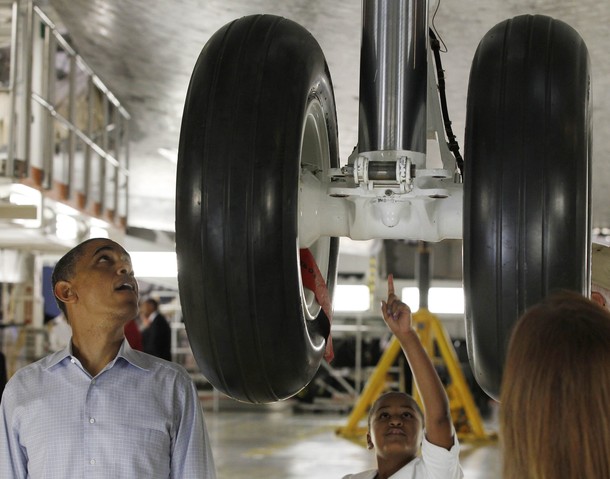 President Barack Obama, first lady Michelle Obama, their daughters Sasha and Malia, and Astronaut Janet Kavandi, walk under the landing gear from beneath the nose of Space Shuttle Atlantis as they visit Kennedy Space Center in Cape Canaveral