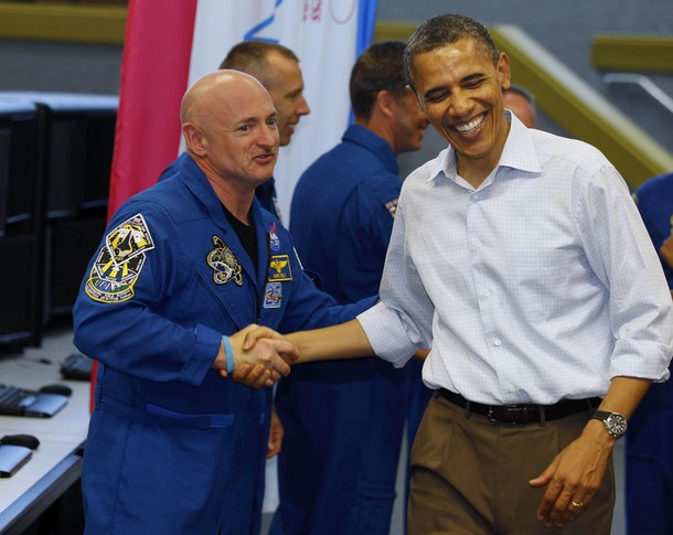 Pool report: Potus met with Rep. Giffords for approx 10 minutes before he came down to meet the full crew. Prior to going in to see her, Potus greeted Mark Kelly in a corridor. “I bet you were hoping to see a rocket launch today,” Mr. Kelly said. Replied Potus: “We were hoping to see you.” They shook hands and embraced. Mr. Kelly updated the President and First Lady on Rep. Giffords’ condition, and then they went down the corridor to see her.