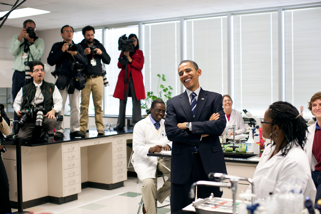 President Obama jumps onto the stage prior to speaking at a town hall meeting, Aug. 17, at Wyffels Hybrids Inc., in Atkinson, Ill