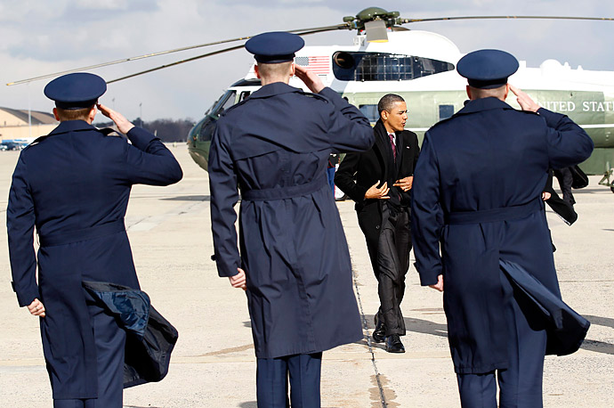 President Obama waves as he boards Air Force One at the Air National Guard Base in Peoria, Ill., en route to Washington after his three-day economic bus tour
