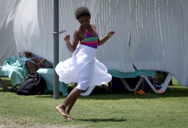 President Barack Obama greets First Lady Michelle Obama and daughter Sasha upon their arrival at a barbecue in celebration of his 49th birthday on the South Lawn of the White House, Aug. 8 (Official White House Photo by Pete Souza)