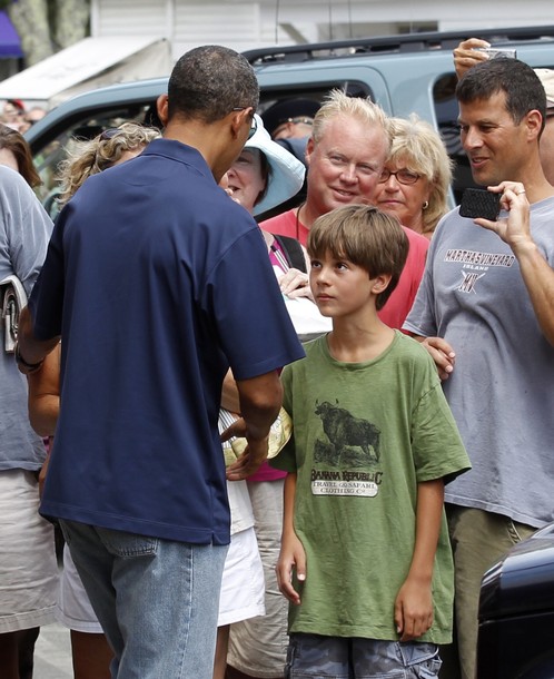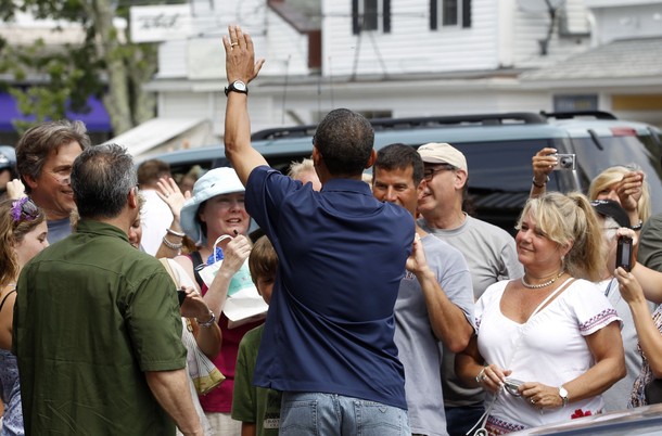 President Obama shakes hands the crowd after he and his daughters visited the Bunch of Grapes Book Store during their vacation on Martha’s Vineyard, August 19