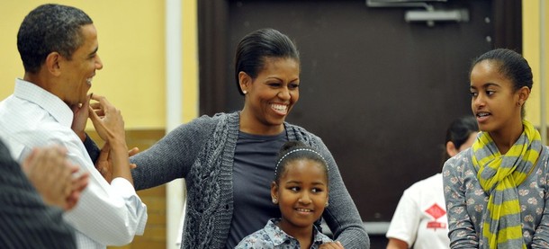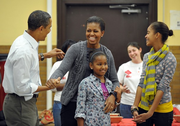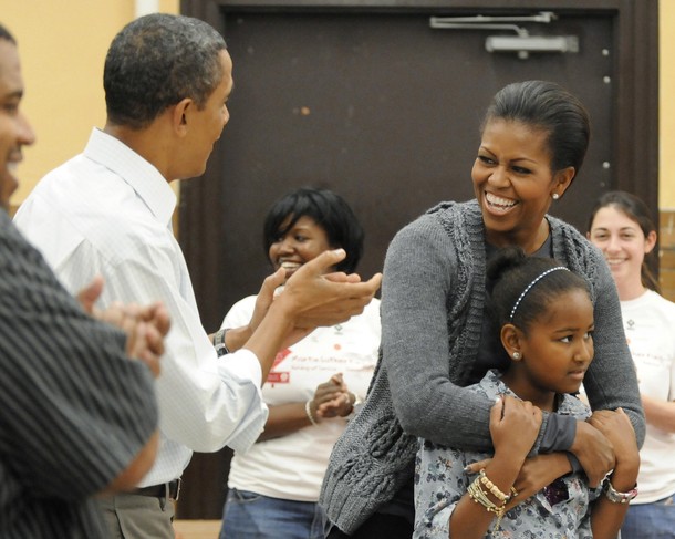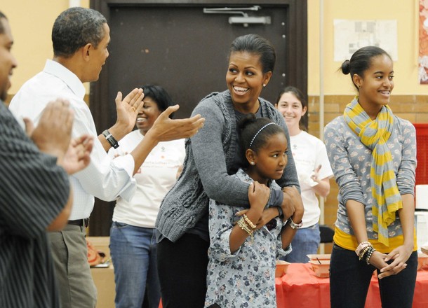 Time: POTUS and FLOTUS, along with Malia and Sasha, entered the cafeteria of Stuart Hobson Middle School around 11:15 am, and were greeted by the folks in the room with a rousing rendition of “Happy Birthday” for the first lady, who is celebrating her 47th birthday today. POTUS looked relaxed and enjoyed singing along…. when they finished FLOTUS said, “All right let’s get to work. This is embarrassing.”