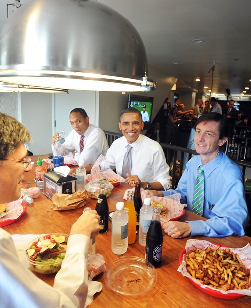 President Barack Obama, flanked by Assistant to the President and Director of Legislative Affairs Rob Nabors, left, and Chief of Staff to the Vice President Bruce Reed, eats lunch at the Good Stuff Eatery, Aug. 3