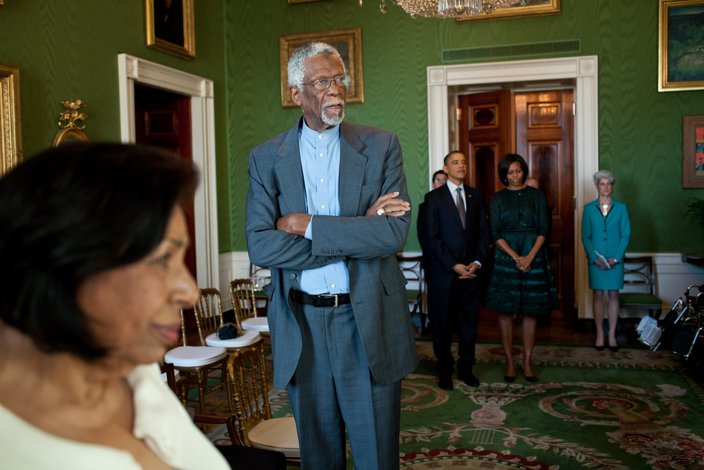 President Barack Obama and First Lady Michelle Obama wait in the Green Room of the White House with Sylvia Mendez and Bill Russell as recipients of the 2010 Presidential Medal of Freedom are introduced in the East Room, Feb. 15, 2011. (Official White House Photo by Pete Souza)