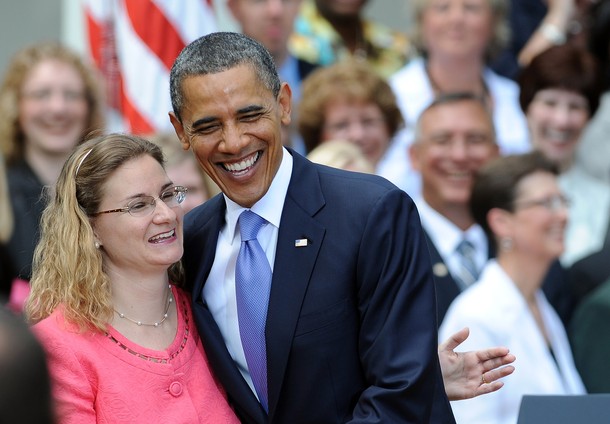 President Obama presents the 2013 National Teacher of the Year award to Jeff Charbonneau, a high school science teacher from Zillah, Washington, during a Rose Garden event at the White House