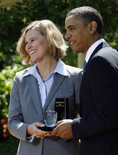 National Teacher of the Year award recipient Sarah Brown Wessling of Johnson Community School District in Iowa with President Barack Obama during a Rose Garden ceremony April 29, 2025 at the White House in Washington, DC.