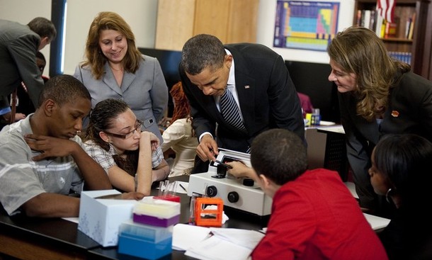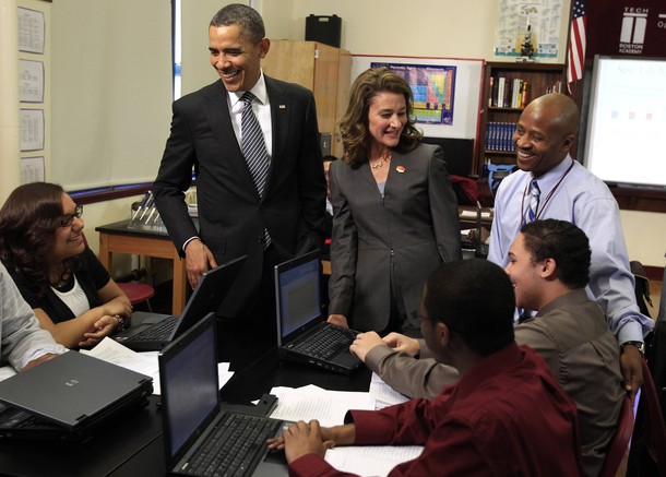 President Barack Obama at a meeting with executives from leading tech companies at the White House. Pictured are: Zynga co-founder Mark Pincus, Yahoo CEO Marissa Mayer, Obama, AT&T Chairman and CEO Randall Stephenson and Facebook COO Sheryl Sandberg.