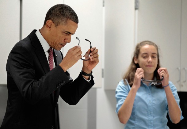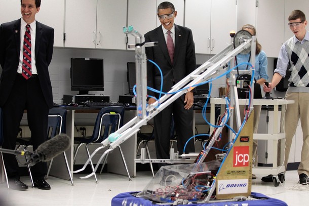 President Obama visits a classroom and watches students Meghan Clark and Nathan Hughes demonstrate the FIRST Robot, a robot created in the school’s prototyping and robotics senior research labs for last year’s FIRST Robotics Competition, at Thomas Jefferson High School for Science and Technology in Alexandria, Virginia. Later in the morning Obama signed the America Invents Act, which reforms patent law so to give a patent to the first applicant rather than the first inventor and allows the woefully underfunded U.S. Patent and Trade Office to set and potentially keep its own fees.