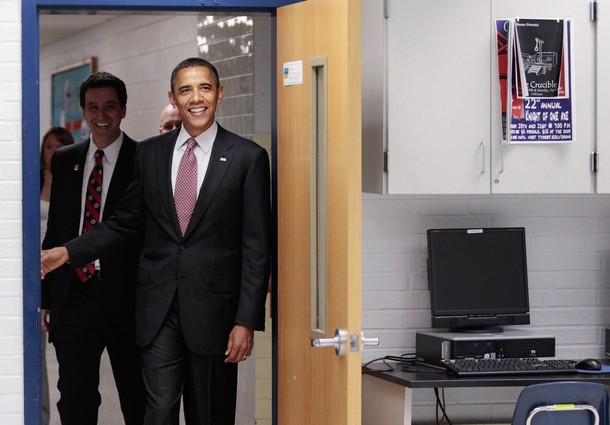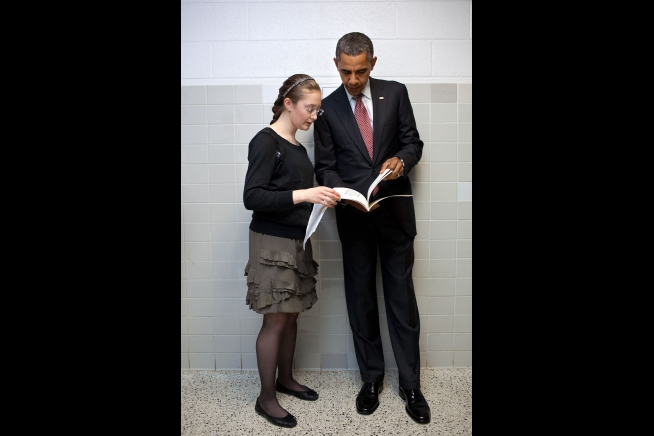 President Barack Obama talks with student Rebecca Hyndman before visiting classrooms at Thomas Jefferson High School for Science and Technology in Alexandria, Va., Sept. 16, 2011. Hyndman, a Senior at Thomas Jefferson, shows the President the patent she received in 2010 for her invention, Under-Floor Storage. (Official White House Photo by Pete Souza)