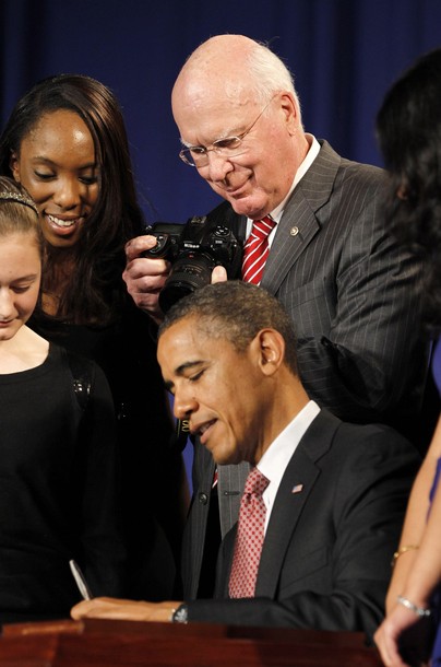 Senator Patrick Leahy takes a picture as President Obama signs the American Invents Act at Thomas Jefferson High School for Science and Technology in Virginia, September 16