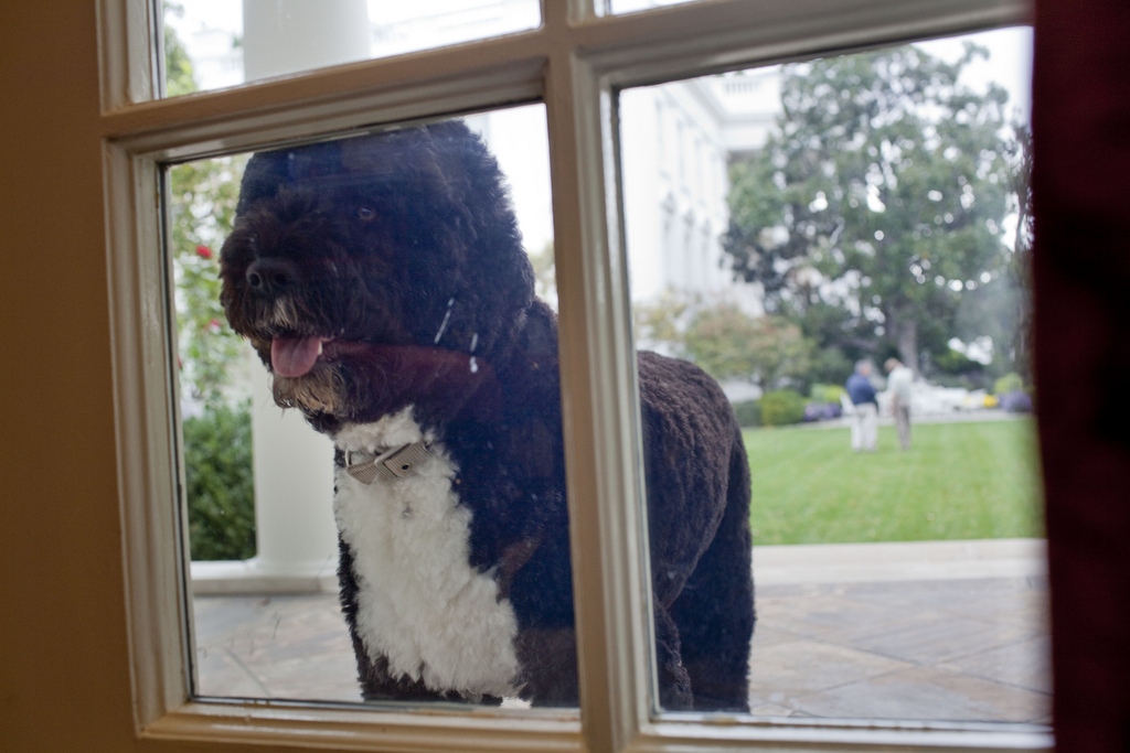 Bo, the Obama family dog, peers into the Outer Oval Office from the White House Colonnade, Oct. 26, 2010. (Official White House Photo by Pete Souza)