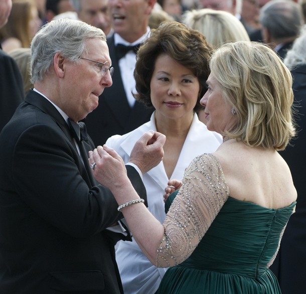 Secretary of State Hillary Clinton speaks with US Senate Minority Leader Mitch McConnell and his wife, former Secretary of Labor Elaine Chao
